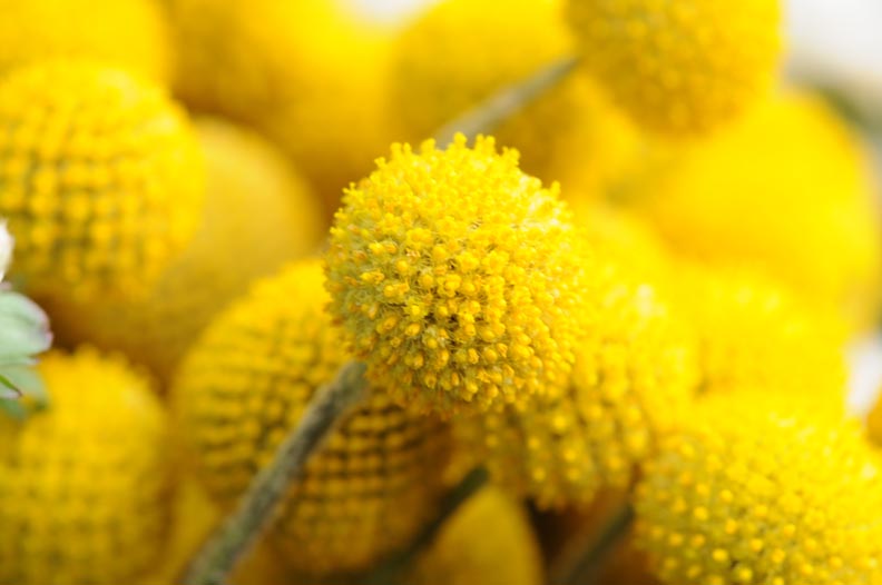 Australian native yellow billy button flowers, craspedia glauca, daisy family asteraceae. Find unique fall flowers, like this adorable, dried billy button bundle in natural golden yellow. This craspedia is the perfect addition to any arrangement for a spot of color and texture.
